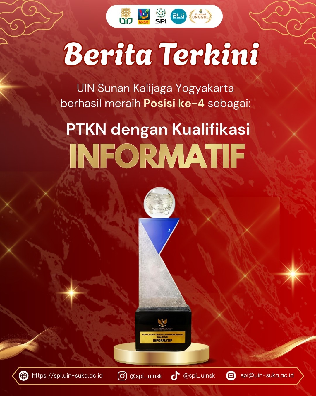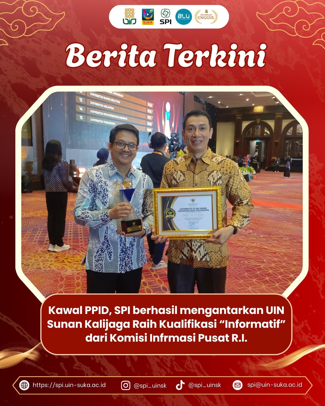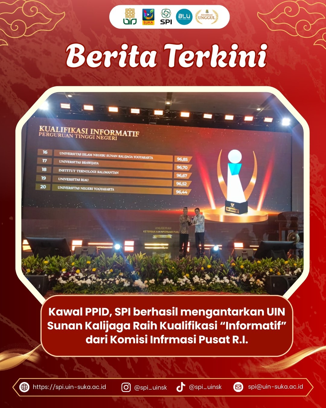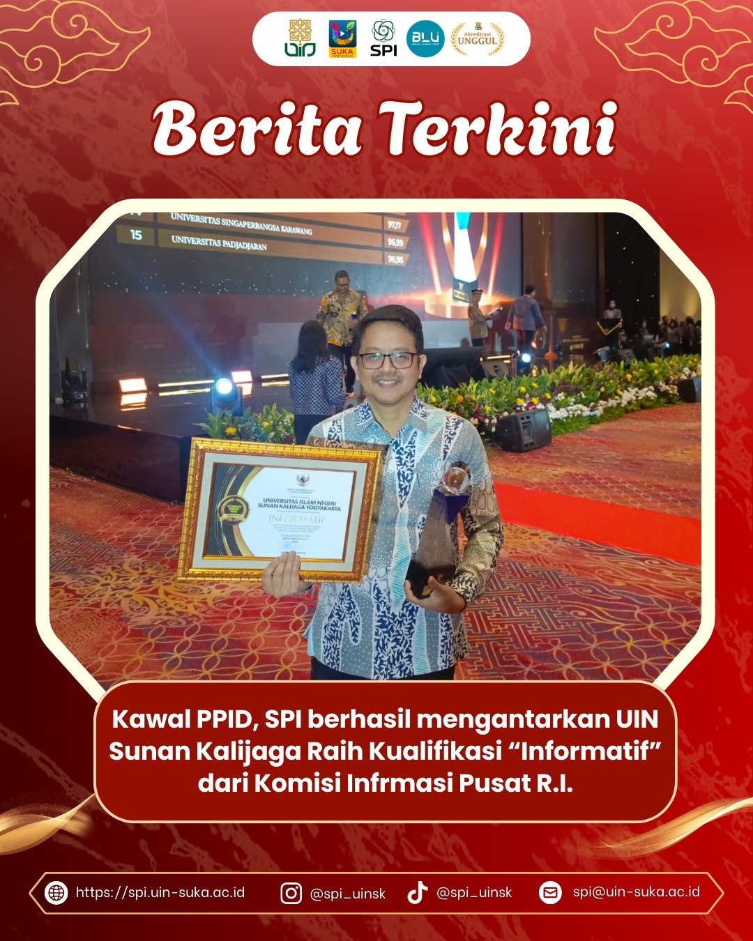 UIN Sunan Kalijaga Yogyakarta kembali mencatatkan prestasi di kancah nasional dengan meraih Anugerah Penghargaan Badan Publik Kualifikasi Informatif pada acara “Anugerah Keterbukaan Informasi Publik Tahun 2025”. Penghargaan ini diterima langsung oleh Rektor, Prof. Norhaidi Hasan, S.Ag., M.A., M.Phil., Ph.D., didampingi oleh Kepala SPI, Dr. Shaleh, S.Ag., M.Pd., CM., CRMP., pada tanggal Senin, 15 Desember 2025, di Birawa Assembly Hall, Hotel Bidakara, Jakarta. Satuan Pengawasan Internal (SPI) UIN Sunan Kalijaga Yogyakarta menyampaikan apresiasi dan ucapan selamat atas capaian tersebut sebagai hasil nyata dari komitmen institusi dalam mewujudkan keterbukaan informasi publik.