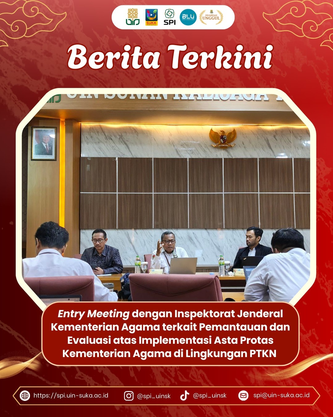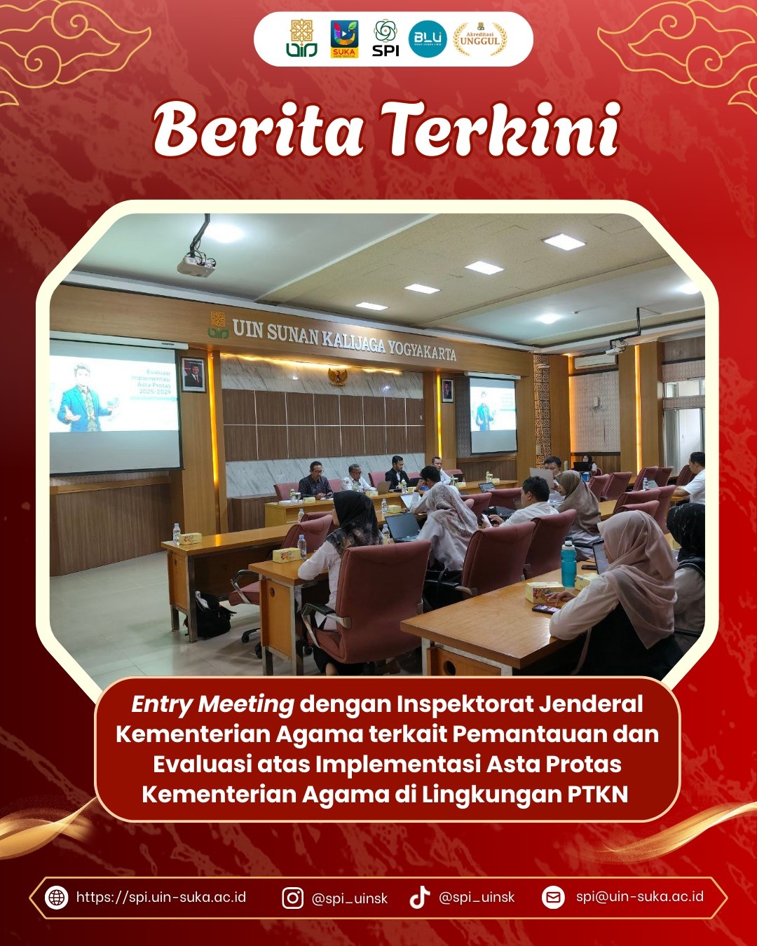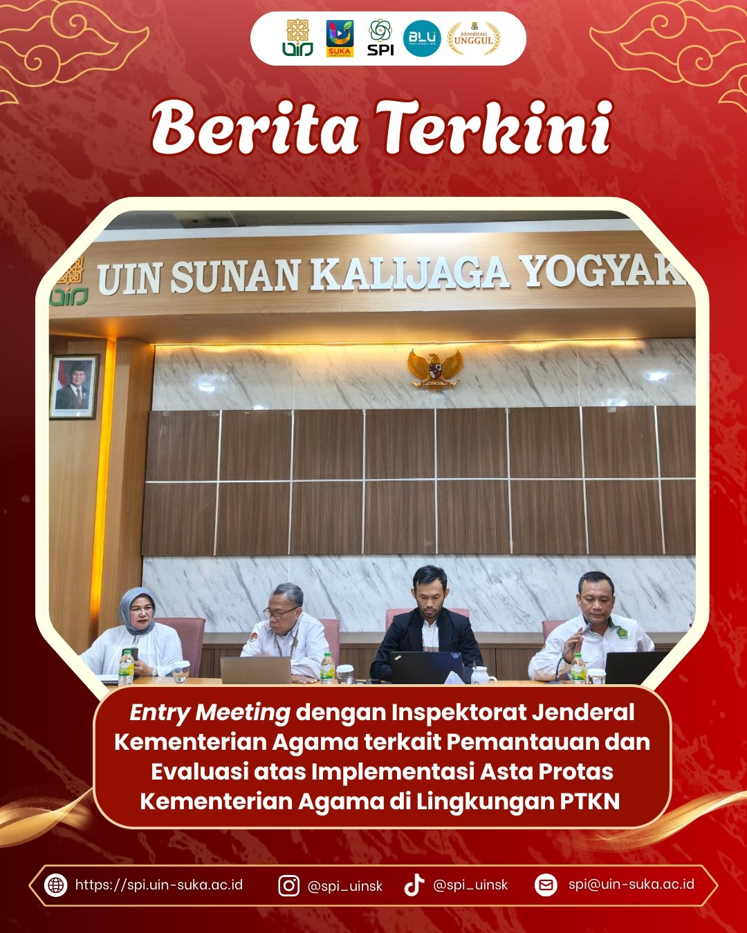 Yogyakarta, 16/12/2025 - Pada hari Selasa, 16 Desember 2025, dilaksanakan kegiatan “Entry Meeting dengan Inspektorat Jenderal Kementerian Agama terkait Pemantauan dan Evaluasi atas Implementasi Asta Protas Kementerian Agama di Lingkungan PTKN” yang bertempat di Ruang Rapat Lantai 3 Gedung Prof. KH. Saifuddin Zuhri PAU. Asta Protas ialah Delapan program prioritas Kementerian Agama yang meliputi: (1) Meningkatkan Kerukunan dan Cinta Kemanusiaan; (2) Penguatan Ekoteologi; (3) Layanan Keagamaan Berdampak; (4) Mewujudkan Pendidikan Unggul, Ramah, dan Terintegrasi; (5) Pemberdayaan Pesantren; (6) Pemberdayaan Ekonomi Umat; (7) Sukses Haji; dan (8) Digitalisasi Tata Kelola.Kegiatan ini dibuka pada pukul 09.00 WIB oleh Sekretaris SPI, Syaifullahil Maslul, M.H. Beliau menyampaikan bahwa kegiatan ini memberikan manfaat sebagai forum penyamaan persepsi, penguatan pemahaman, serta pemberian arahan dan nasihat guna mendukung peningkatan kualitas implementasi Asta Protas di lingkungan PTKN.