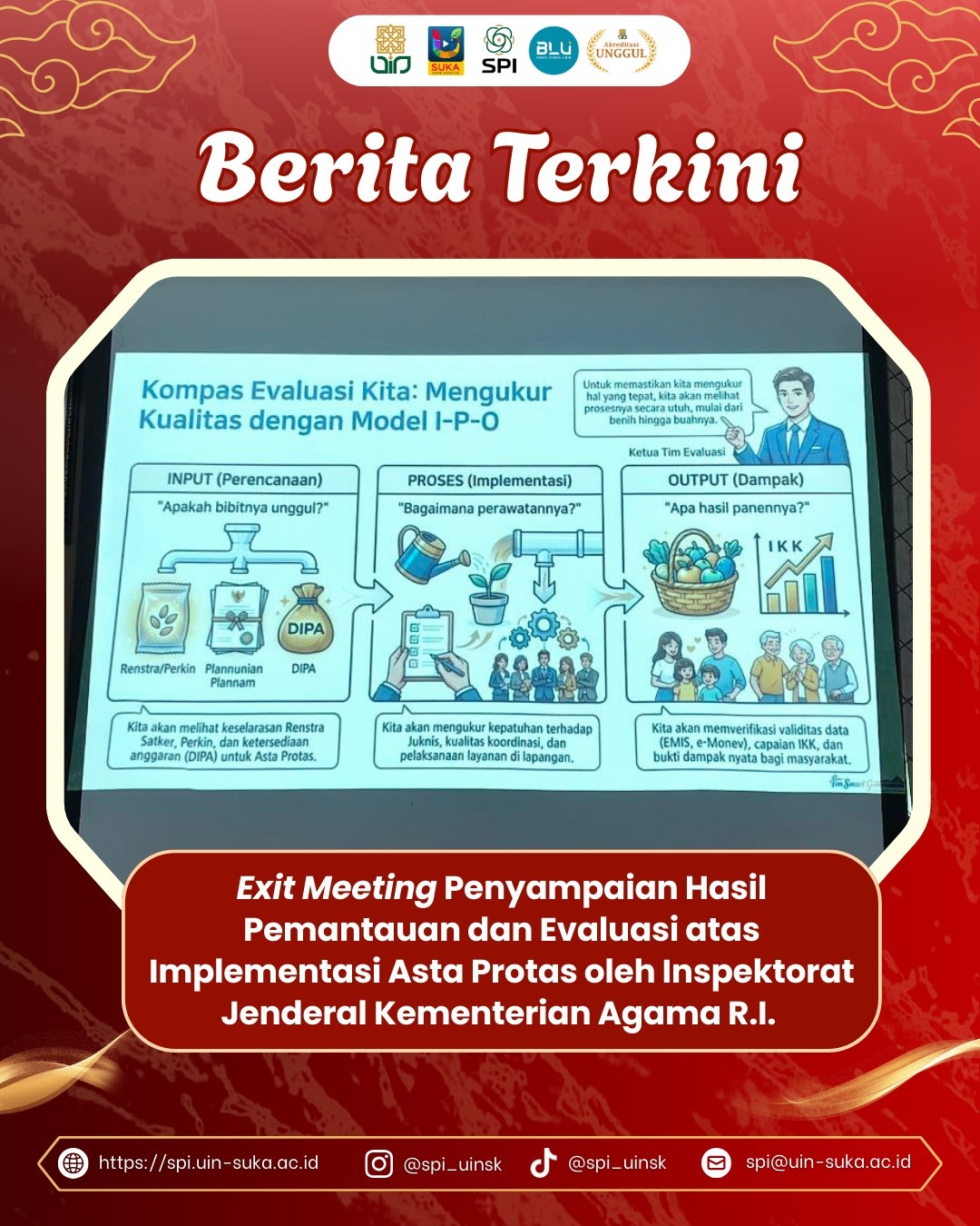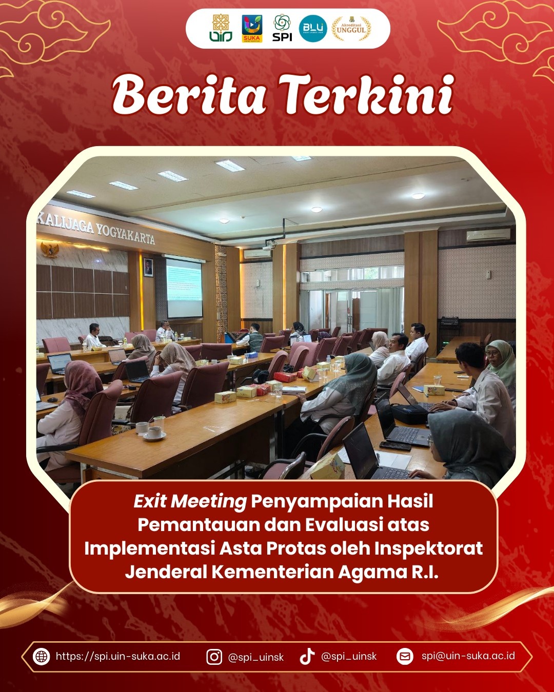 Yogyakarta, 22/12/2025 - Pada Senin, 22 Desember 2025, bertempat di Ruang Rapat Lantai 3 Gedung K.H. Saifuddin Zuhri UIN Sunan Kalijaga Yogyakarta, dilaksanakan kegiatan Exit Meeting Penyampaian Hasil Pemantauan dan Evaluasi Implementasi Asta Protas oleh Inspektorat Jenderal Kementerian Agama Republik Indonesia. Kegiatan yang dimulai pukul 14.00 WIB ini dibuka oleh Kepala Satuan Pengawasan Internal (SPI) UIN Sunan Kalijaga Yogyakarta, Bapak Dr. Shaleh, S.Ag., M.Pd., C.M., CRMP, yang sekaligus bertindak sebagai moderator.